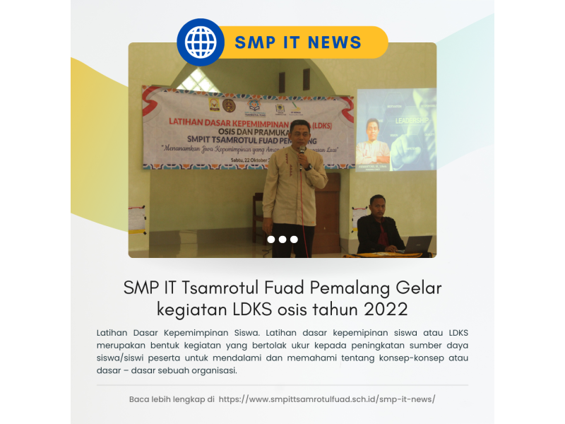 Pemalang (26/10) - Sekolah Islam Terpadu (SMP IT) Tsamrotul Fuad Pemalang menggelar LDKS dengan tema "Menanamkan jiwa kepemimpinan yang Amanah dan Berwawasan luas" Pesertanya terdiri dari siswa dan siswi Pengurus Osis kelas 7 & 8, dengan dipanit ...