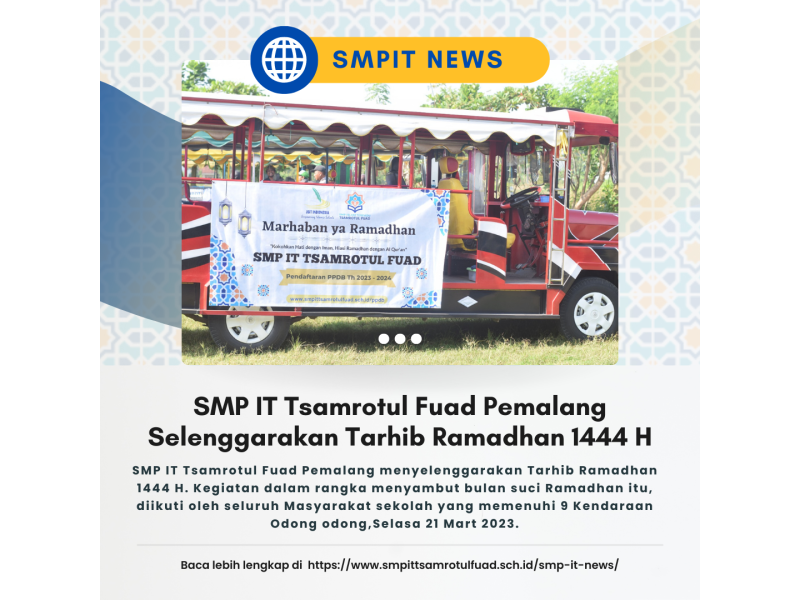 SMPIT NEWS- SMP IT Tsamrotul Fuad Pemalang menyelenggarakan Tarhib Ramadhan 1444 H. Kegiatan dalam rangka menyambut bulan suci Ramadhan itu, diikuti oleh seluruh Masyarakat sekolah yang memenuhi 9 Kendaraan Odong odong,Selasa 21 Mart 2023. ...